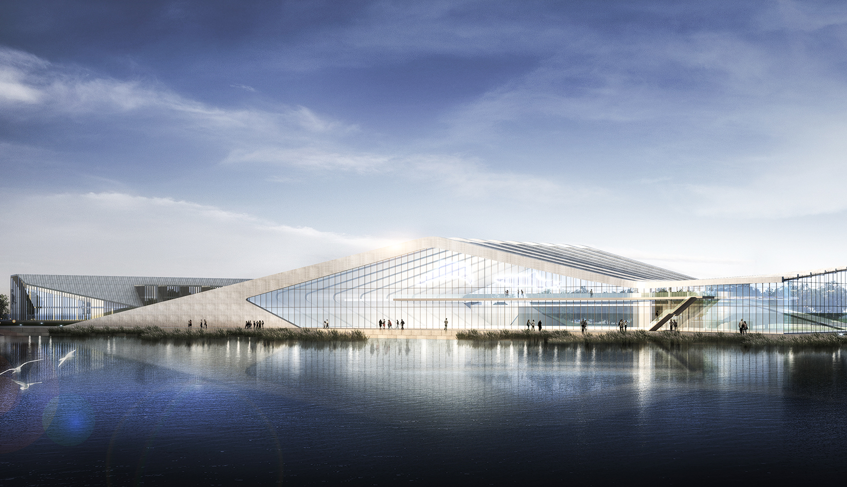 海洋科技館坐落在中科院青島科教園沿海區(qū)的中心地帶,沿海岸線呈一字型布局。方案設計以浪花和貝殼為意象,建筑像從場地中生長出來,擁有著與海浪一樣流暢的外形,在與基址和諧相融的同時,也呼應著青島的城市文化和人文關系。大跨度鋼結構結構排架為大空間的開放展示提供了可能,同時營造了無間斷的觀??臻g??萍拣^外墻以玻璃幕墻為主,保證了觀海景觀通透性。