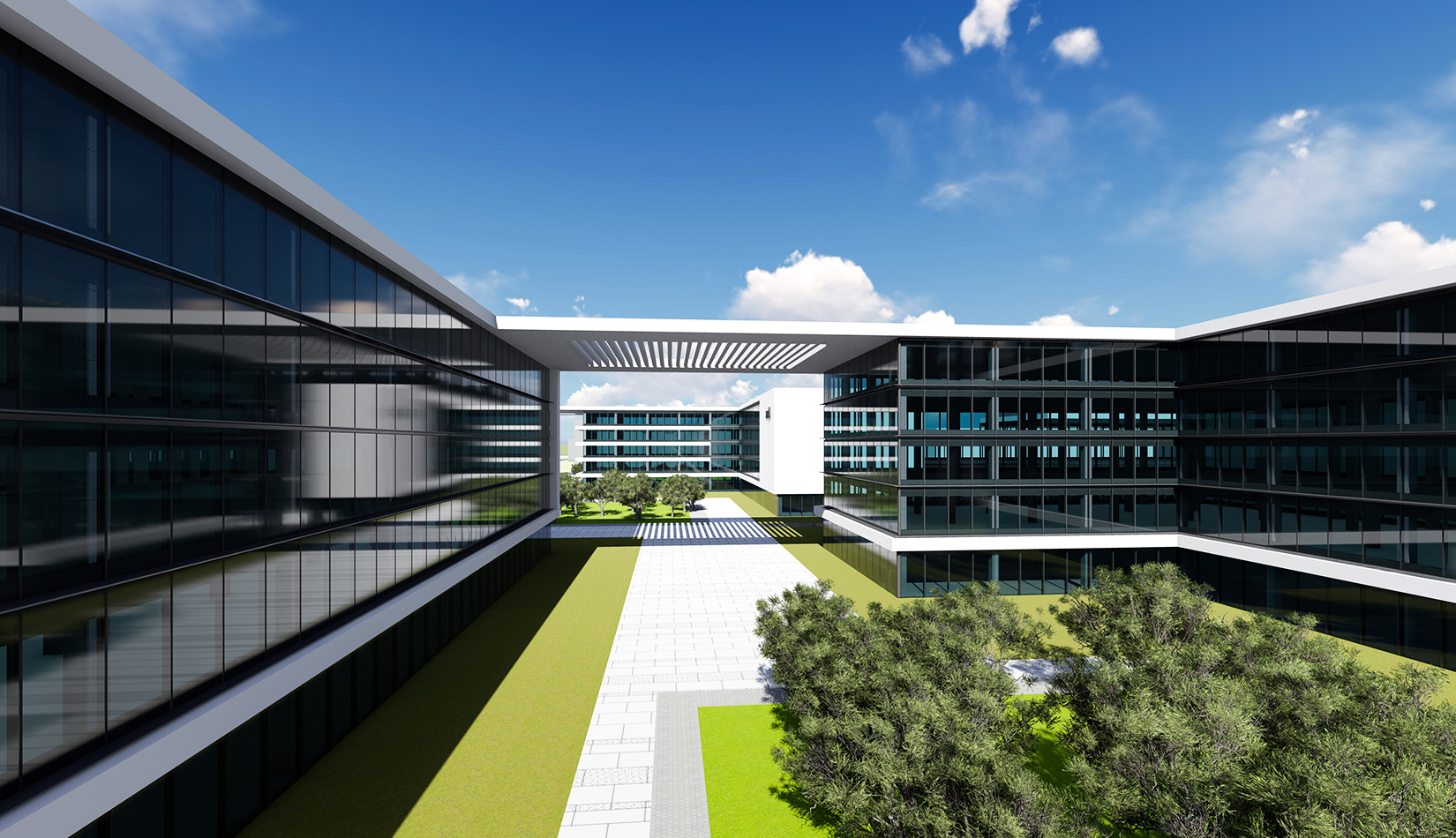 以芯片雙核“互聯(lián)互通” 為基礎(chǔ)概念,轉(zhuǎn)化為建筑空間,形成與世界接軌,和諧五環(huán)的理念。立面上抽象出3D打印機(jī)的形態(tài),使建筑具有現(xiàn)代雕塑感。