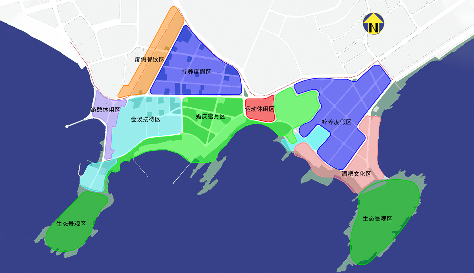 秉持:“整體性積極保護(hù)、減法為主、功能提升、公眾開放”的原則,整飭形成度假餐飲、游憩休閑、會(huì)議接待、婚慶蜜月、運(yùn)動(dòng)休閑、酒吧文化、療養(yǎng)度假與生態(tài)景觀區(qū)。