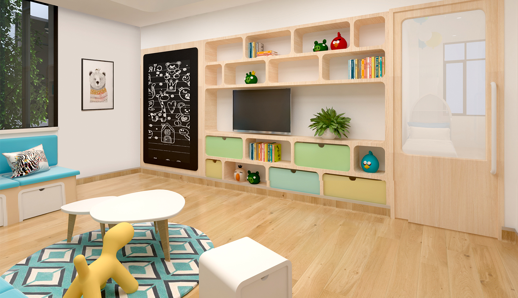 室內(nèi)延續(xù)建筑,空間內(nèi)部采光非常好。設(shè)計(jì)簡潔、現(xiàn)代,以白色為主色調(diào),搭配淺木色作為室內(nèi)顏色。活潑、好動(dòng)、天真、可愛是兒童最大的特點(diǎn),在其具體功能空間設(shè)計(jì)中,我們把這些特點(diǎn)和空間色彩結(jié)合起來,不同的空間根據(jù)其使用功能,采用了不同的色彩搭配。