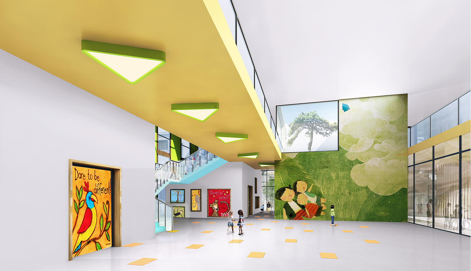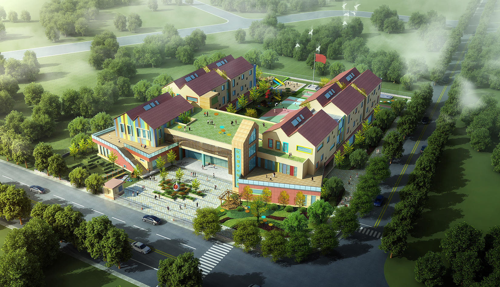 建筑造型來源于兒童最初對房子的印象并進行延伸,加上積木搭接形態(tài),形成C字形圍合的主體建筑,就像父母溫暖的懷抱;建筑造型跟兒童產(chǎn)生很好的親切感,讓兒童將上幼兒園成為快樂的事情。同時形態(tài)結(jié)合地緣文化特色,采用雙折坡屋頂,寓意展翅翱翔的海鷗。