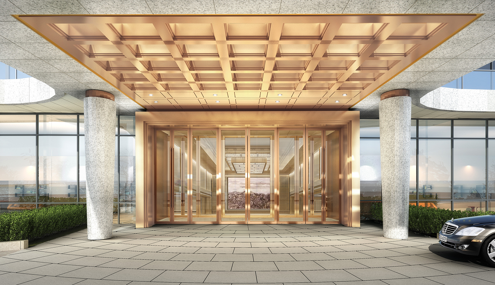 一層走廊---走廊為大廳一部分延續(xù)迎賓大廳的設(shè)計(jì)風(fēng)格,天花跌級(jí)有序,方圓向上,內(nèi)嵌如意紋理淺雕銅板, 增加厚重、文化與層次,墻面挺拔向上轉(zhuǎn)折有序,頭尾嵌入水紋樣式銅板雕刻,增加儀式感與莊重性,同時(shí)提升文化附加,簡(jiǎn)練現(xiàn)代、精致細(xì)節(jié),突顯別致有序、莊重典雅。