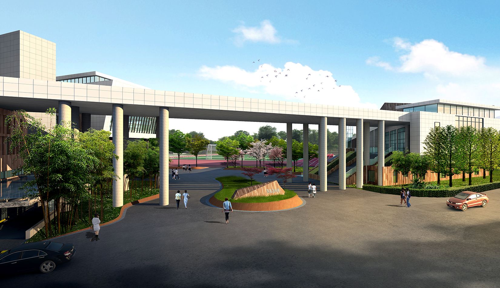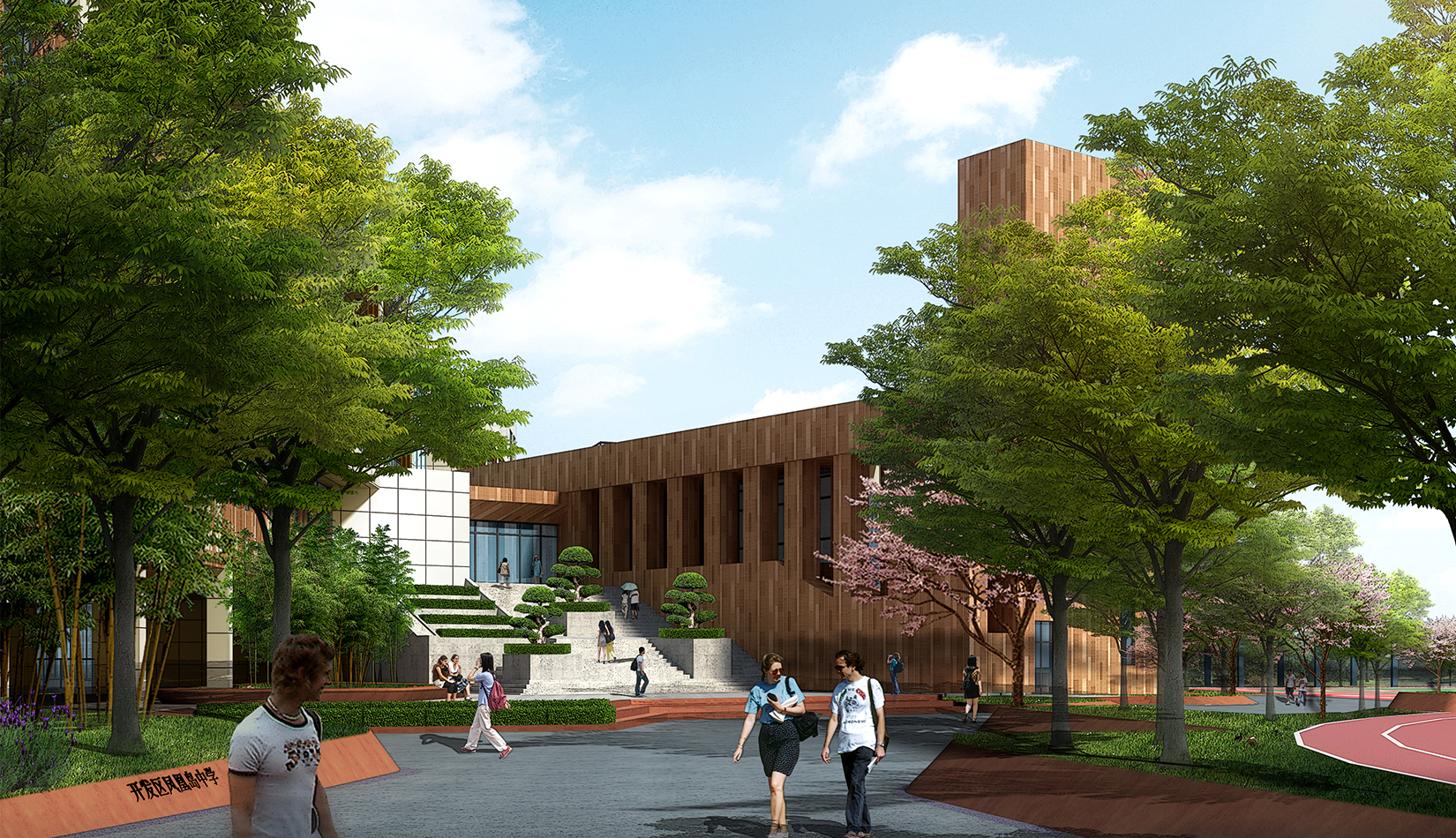 1. 將抽象化的鳳翎設計成特色種植,結(jié)合建筑形態(tài)配以流線型鋪裝設計,在鋪裝上增加鳳凰島中學校訓校風的細節(jié)設計,凸顯學校濃郁的文化氛圍以及室外景觀環(huán)境的精致。