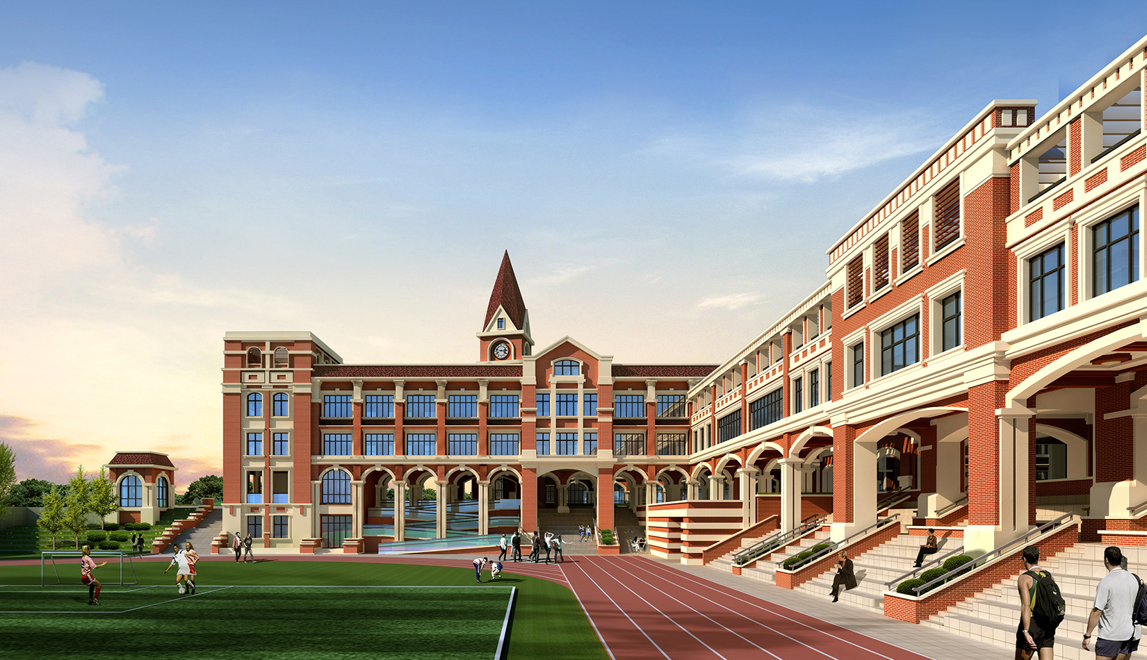 校園建筑風格采用簡約歐式風格,以明亮、歡快的紅磚作為校園主體色調(diào),通過淺色石材、線腳的穿插勾勒建筑輪廓,形成極具特色的歐式花園式校園。