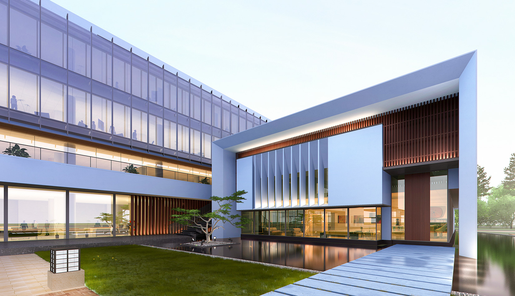 作為中韓貿(mào)易合作區(qū)一期啟動(dòng)區(qū)的重點(diǎn)項(xiàng)目,其承擔(dān)著對(duì)外展示以及為后續(xù)發(fā)展提供服務(wù)平臺(tái)的功能。因此設(shè)計(jì)力求穩(wěn)重大氣,以4 層的體量打造出地標(biāo)性的建筑。設(shè)計(jì)運(yùn)用簡(jiǎn)潔的外形、寧?kù)o的色彩,外立面以白色涂料和木格柵為主,尊重自然,打造一種平和寧?kù)o的感覺(jué)。在空間設(shè)計(jì)上通過(guò)共享空間、上人露臺(tái)和一層大平臺(tái),創(chuàng)造出舒適宜人的工作環(huán)境;在技術(shù)上通過(guò)地源熱泵、呼吸式幕墻、雨水收集等的應(yīng)用,實(shí)現(xiàn)建筑的綠色節(jié)能環(huán)保。
