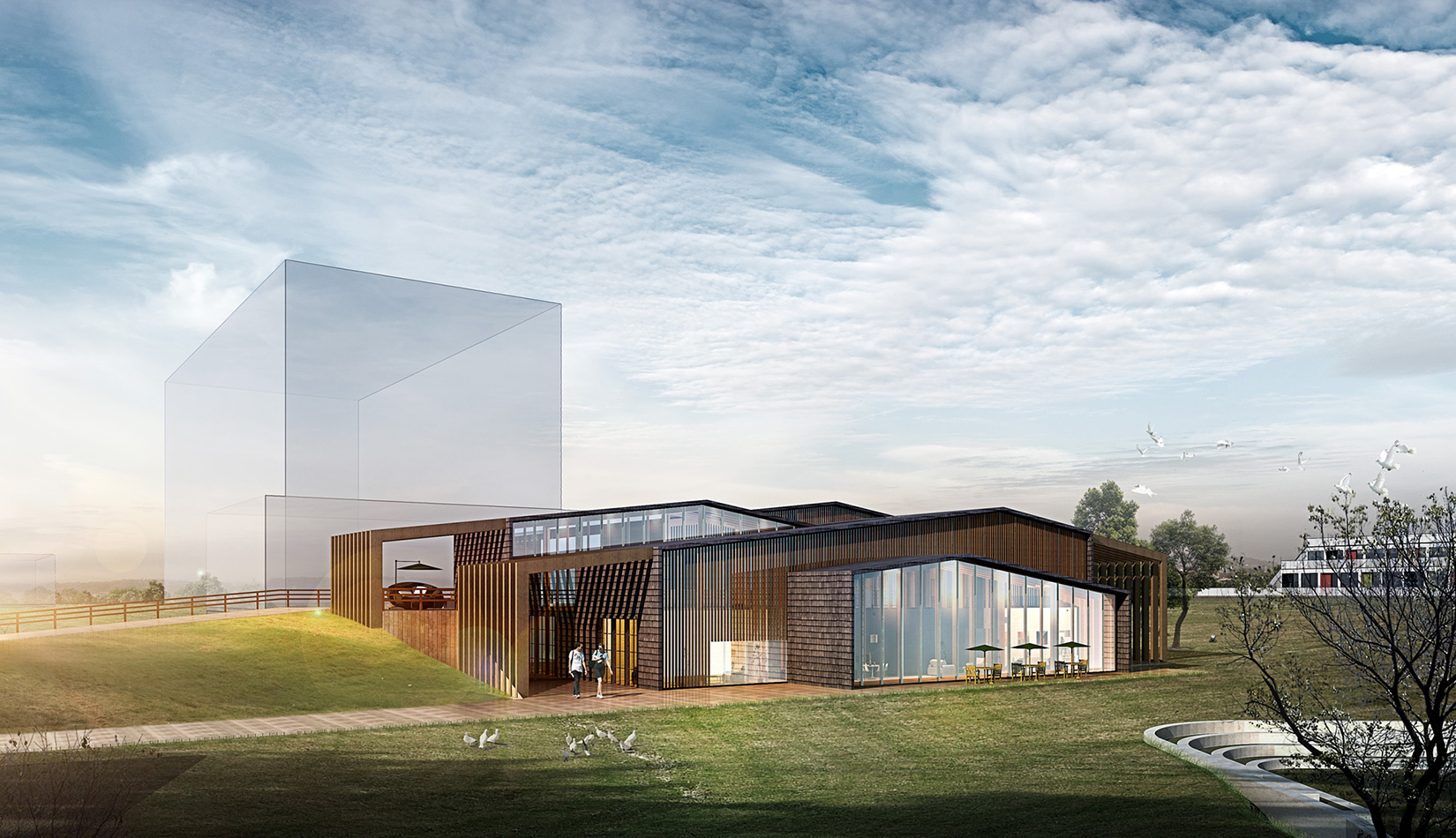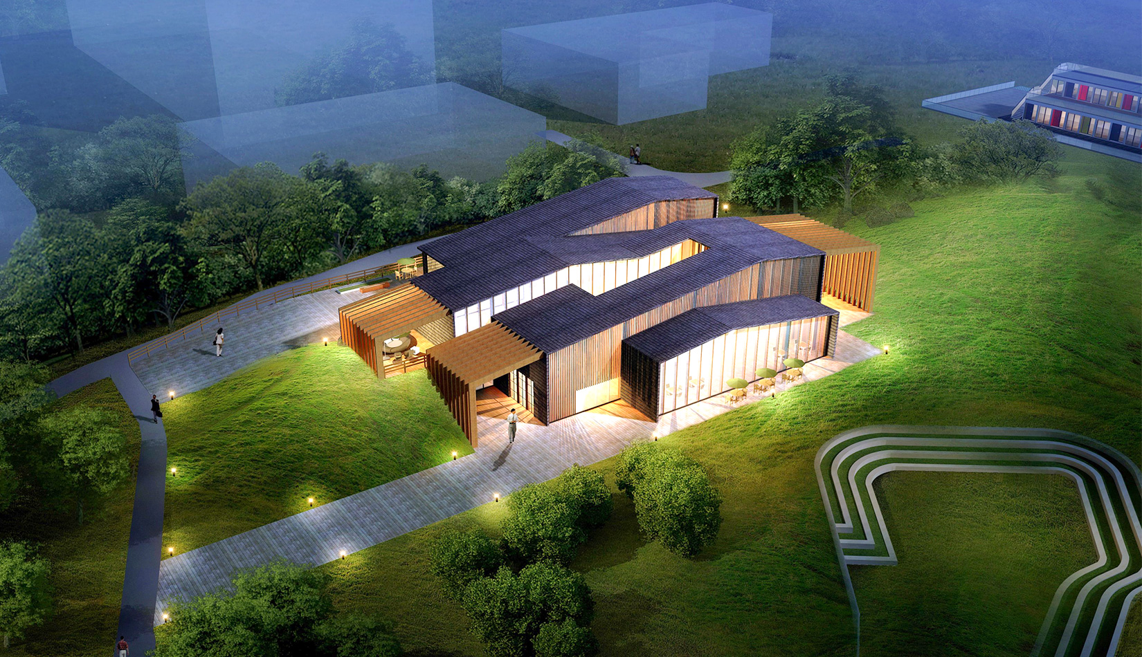 項目選址位于“中德創(chuàng)意設(shè)計 D-ZONE”地塊中,天然的谷地和水流,以草地為主。 考慮到周邊建筑及環(huán)境,確定了交錯的疊合的取景形式,致力于增加觀景表面積將美景框入窗中。 辦公區(qū)、多功能廳、展覽區(qū)、室外展廳和自然環(huán)境相互交融并置,相互之間流線獨(dú)立又彼此滲透。