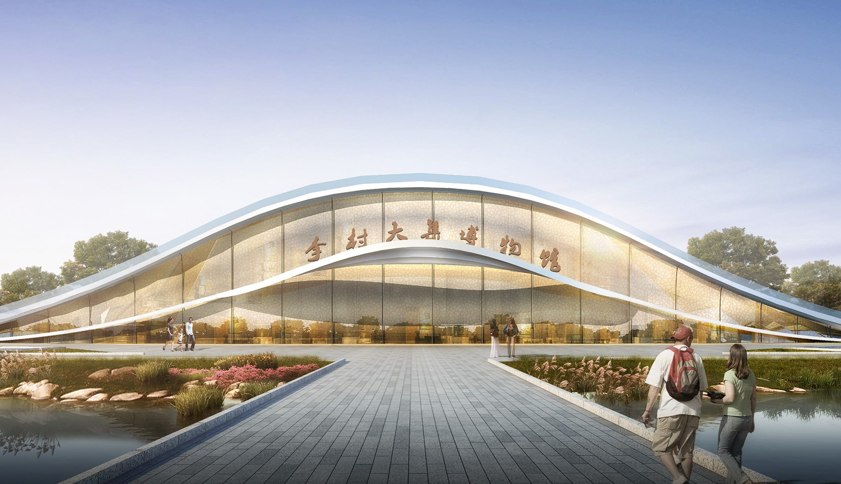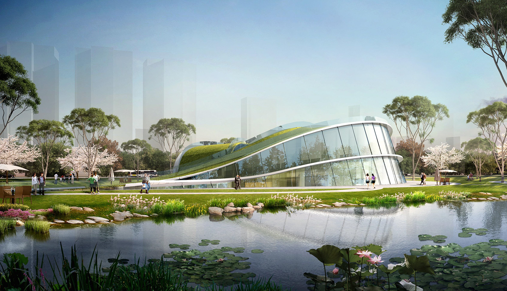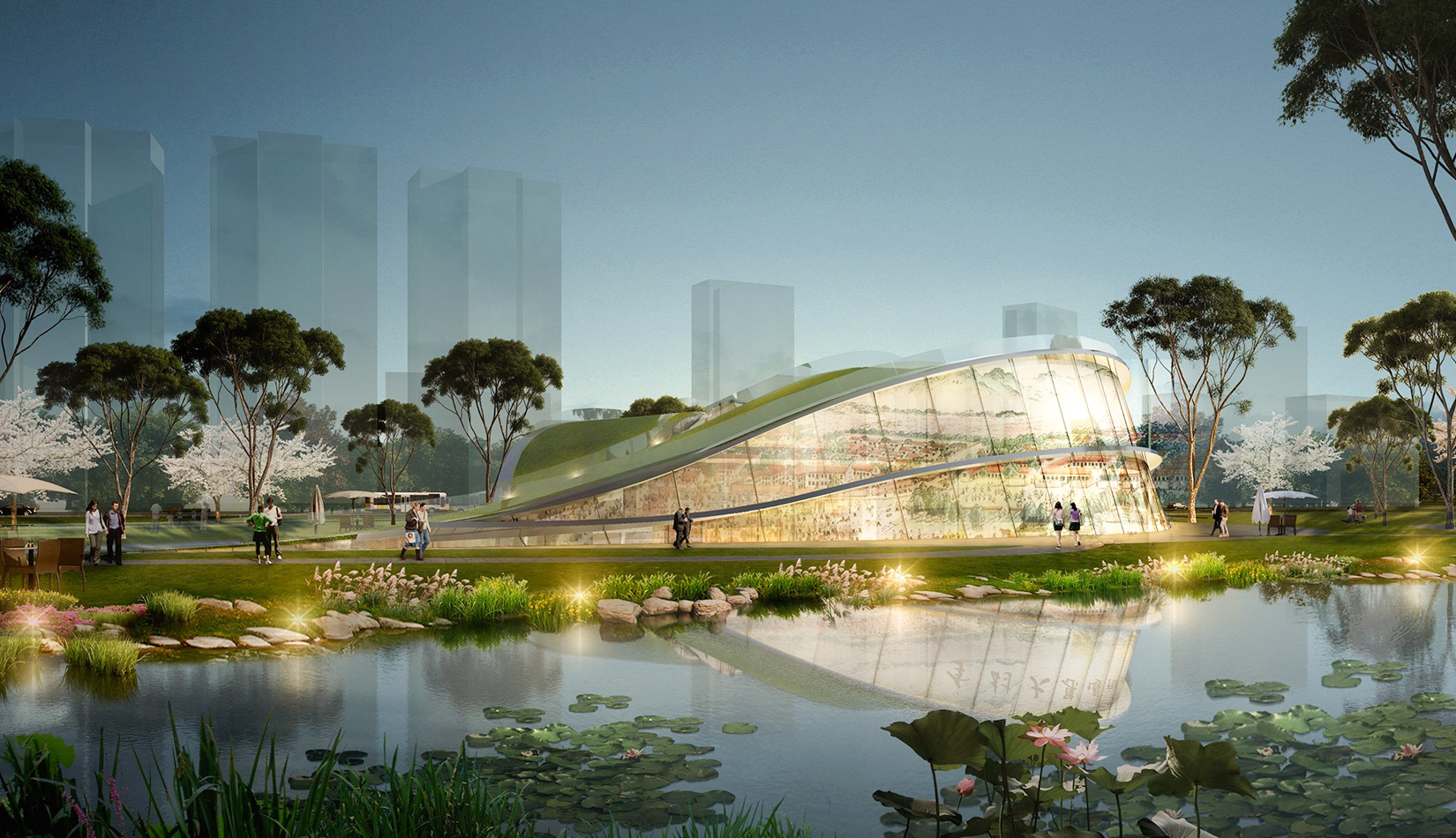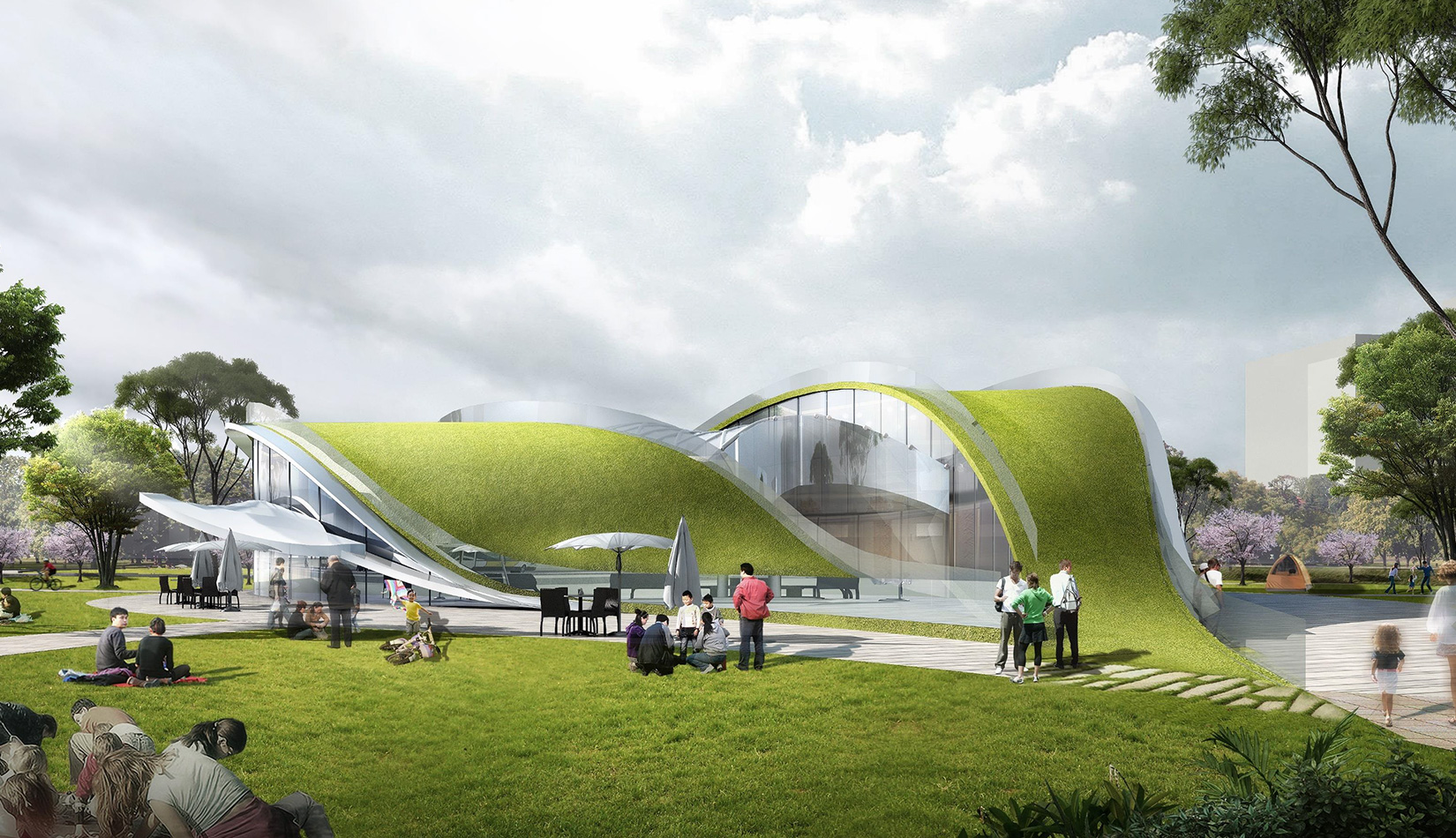該項目基地位于濱河公園內(nèi),目標(biāo)要將博物館打造成一個生態(tài)建筑,建筑能與環(huán)境有機(jī)融合。在這一理念下,將博物館設(shè)計為樹葉形,建筑猶如一片樹葉飄落在公園內(nèi),以此體現(xiàn)建筑與環(huán)境的融合。將樹葉形建筑設(shè)計為覆土建筑,最大程度還原基地一片綠色,以此呼應(yīng)李村大集的“還原”內(nèi)涵。通過設(shè)計兩個曲線形體相互交融形成建筑的最終體量,以此體現(xiàn)相逢意蘊,呼應(yīng)李村大集的“相逢”內(nèi)涵。