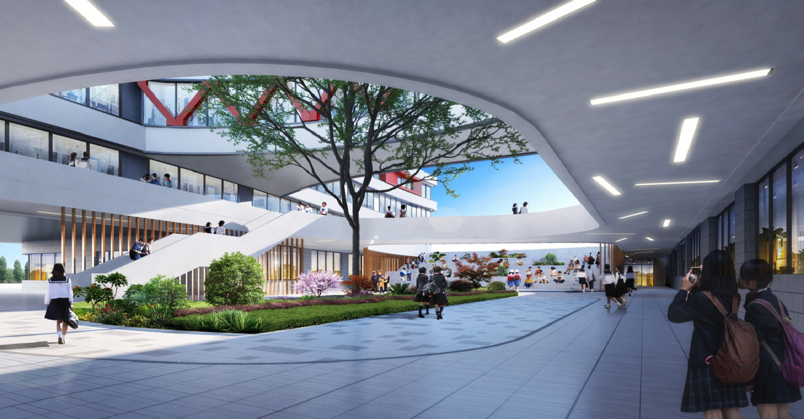 校園規(guī)劃采用曲線手法,營(yíng)造流水姿態(tài),將東側(cè)山脈與西側(cè)河流連接在一起。設(shè)計(jì)現(xiàn)代化“山水”校園,使學(xué)生在自然中成長(zhǎng)。營(yíng)造活水發(fā)源的“源頭”意境,寓意教育為人類文化長(zhǎng)河的源頭,呼應(yīng)學(xué)?!霸搭^”文化。曲線舒展的形體,整體采用白色色調(diào),局部以紅黃色進(jìn)行點(diǎn)綴,風(fēng)格純潔又不失活潑。